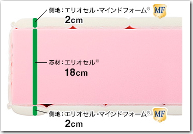 芯材の中心には硬めの素材エリオセルを18cm使用し、その周りの側地の中には柔らかい感触が特徴のエリオセルMFを2cm使用しています。